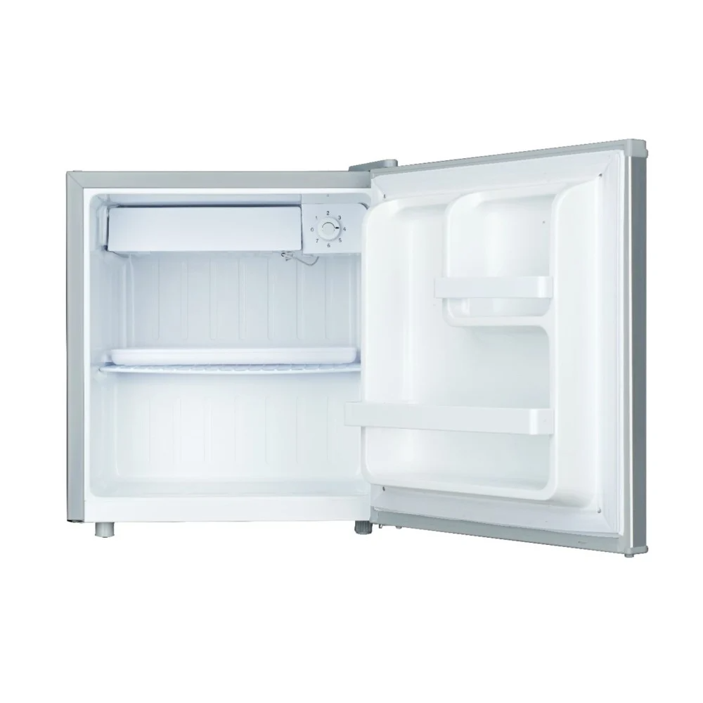 - الثلاجة الصغيرة ذات الباب الواحد لونها فضي وتبلغ سعتها 48 لترًا.